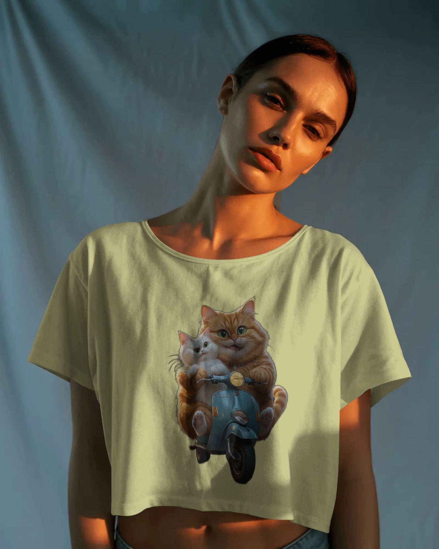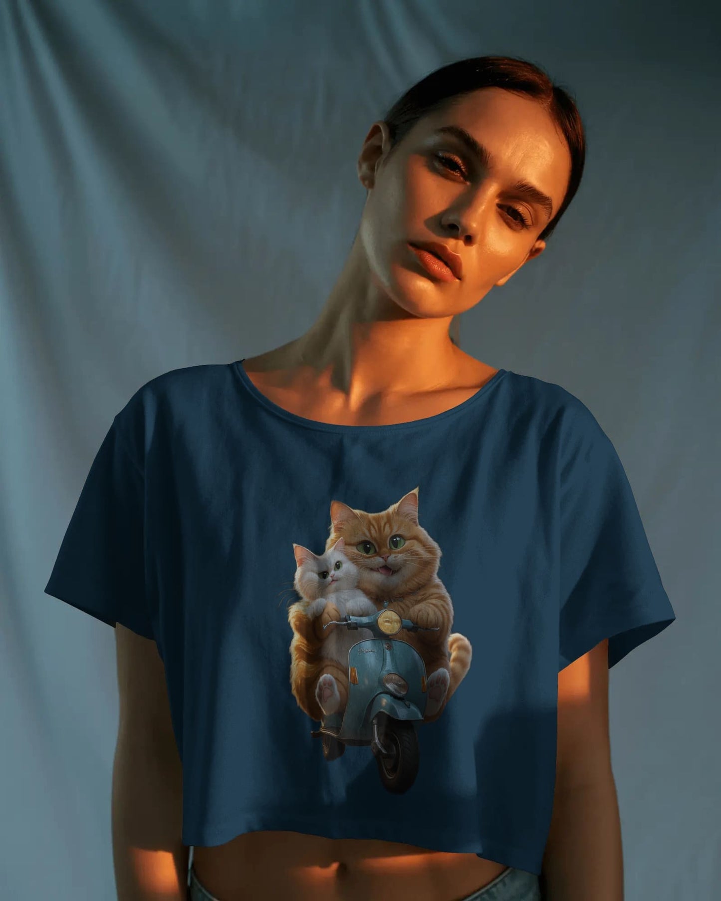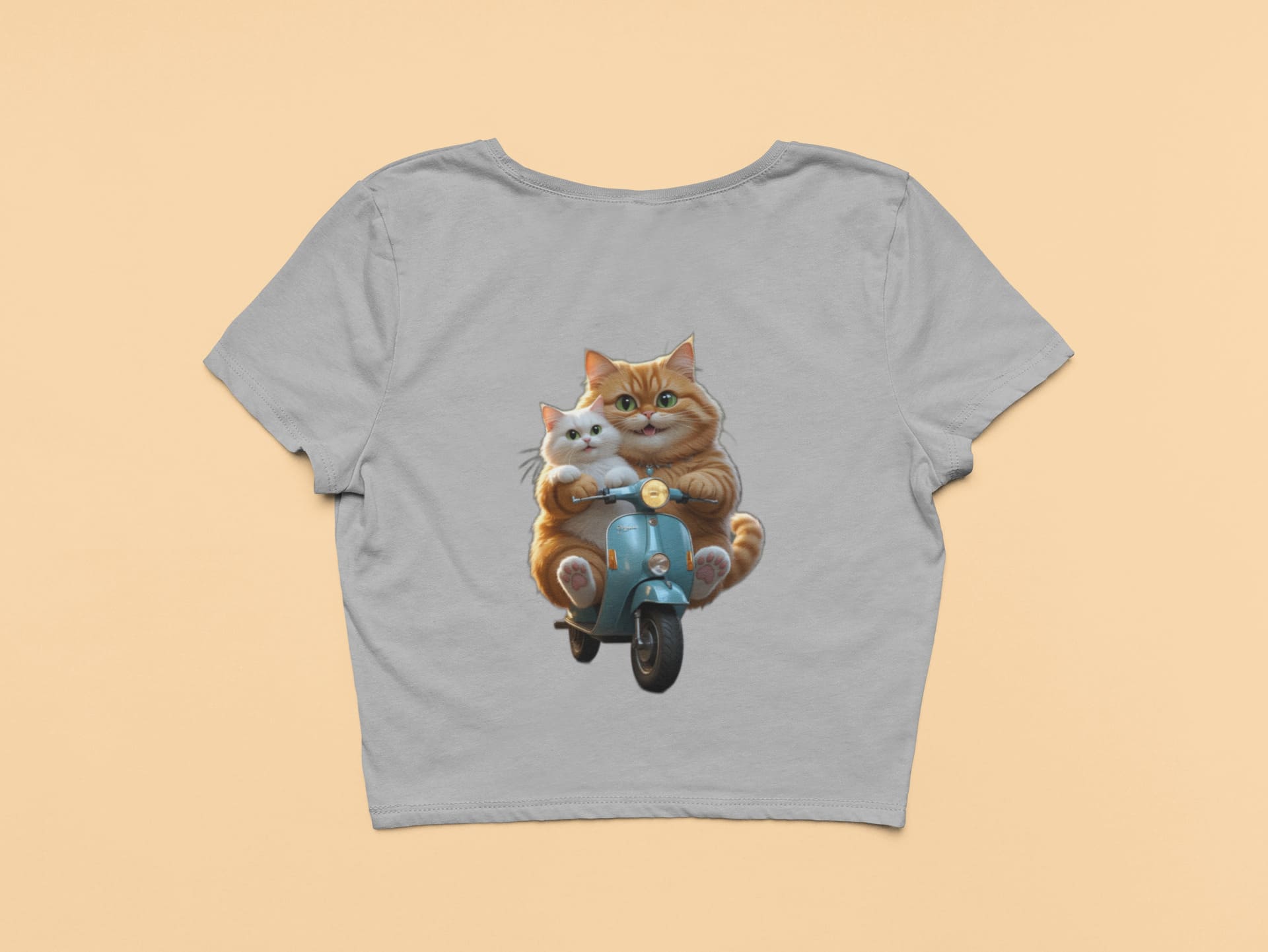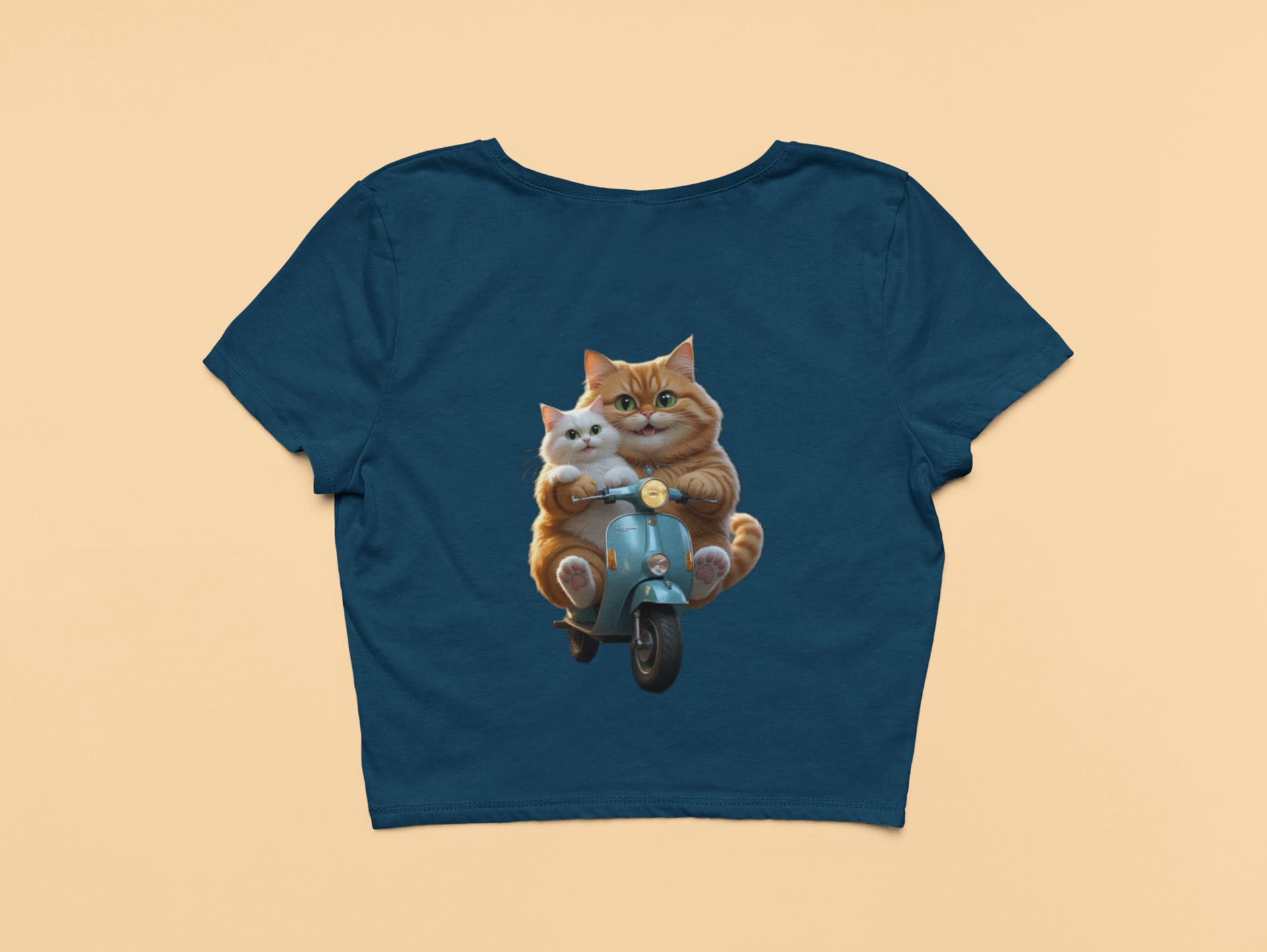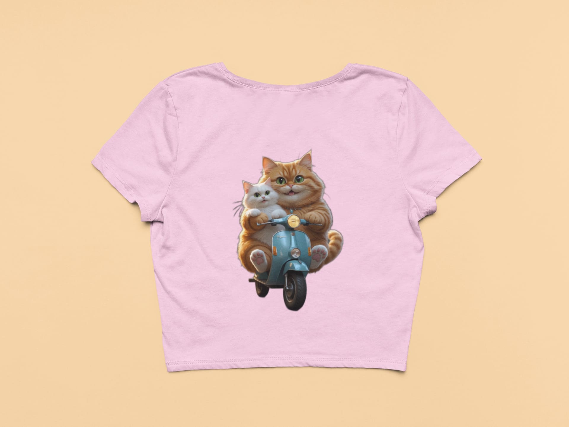 Trendy & Stylish Women’s Crop Top – Cute Cat on Scooter Design