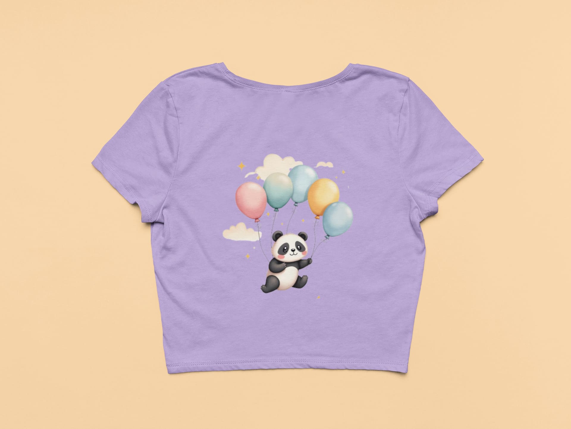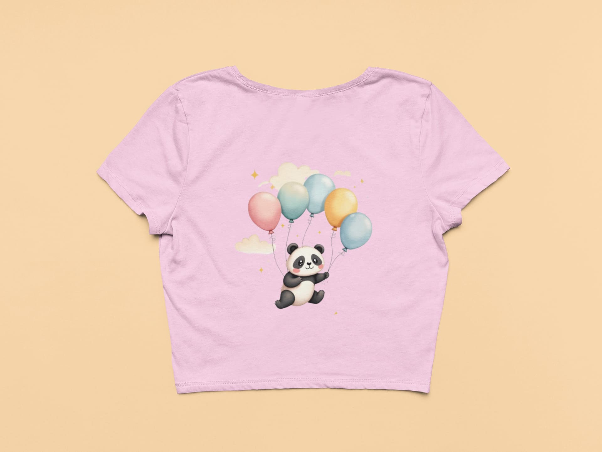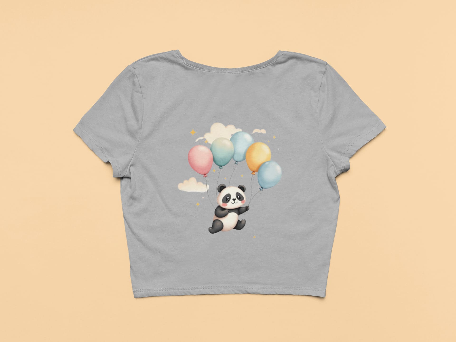Add a playful and whimsical touch to your wardrobe with this chic crop top, featuring a cute panda soaring with colorful balloons. Perfect for casual outings, college days, or fun hangouts, this top combines comfort with cheerful, eye-catching charm.