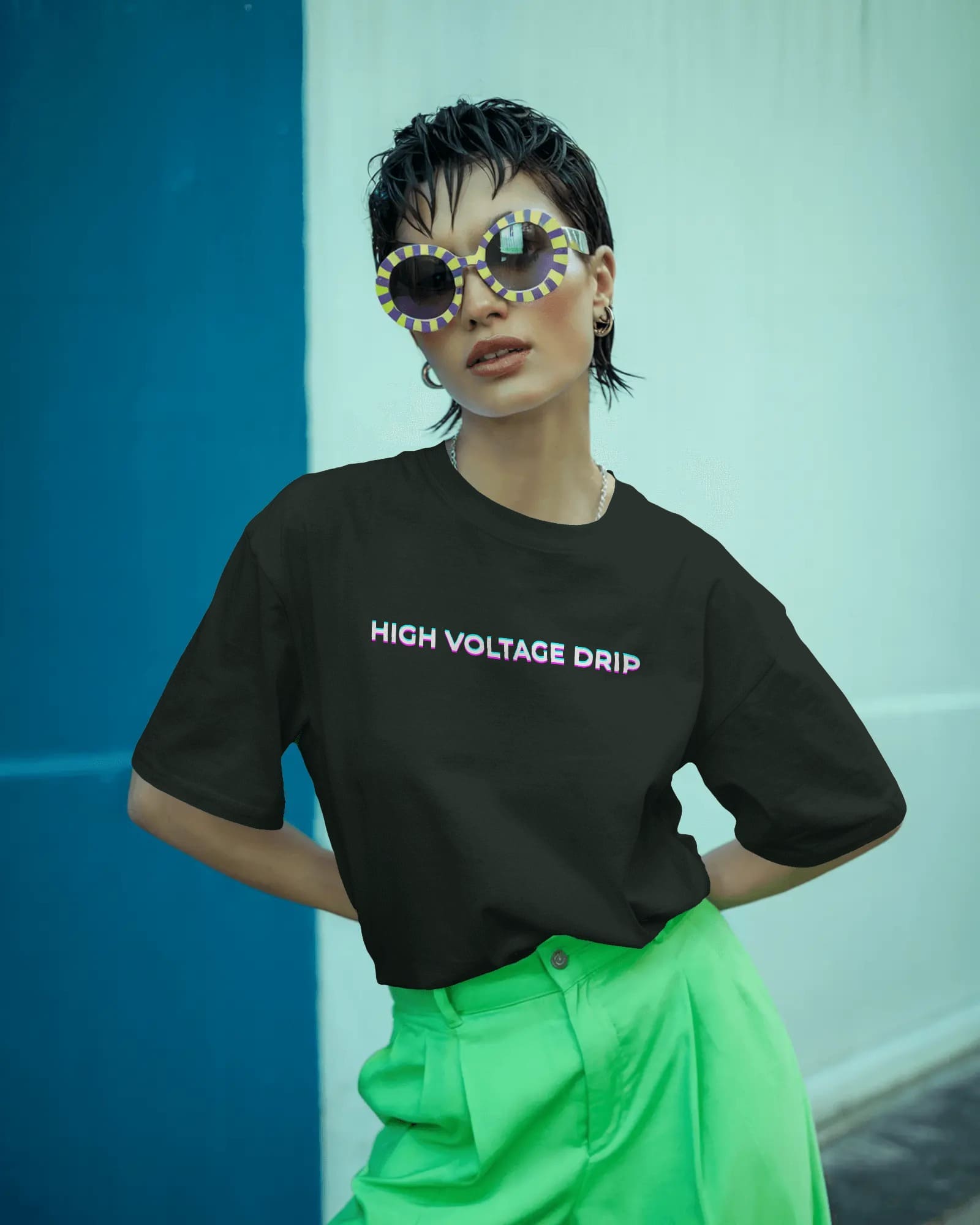Amp up your streetwear with our oversized t-shirt featuring “High Voltage Drip” text on the front and a striking Transmission Tower design on the back. This unisex cotton tee combines bold graphics with all-day comfort, making it a must-have for streetwear enthusiasts.