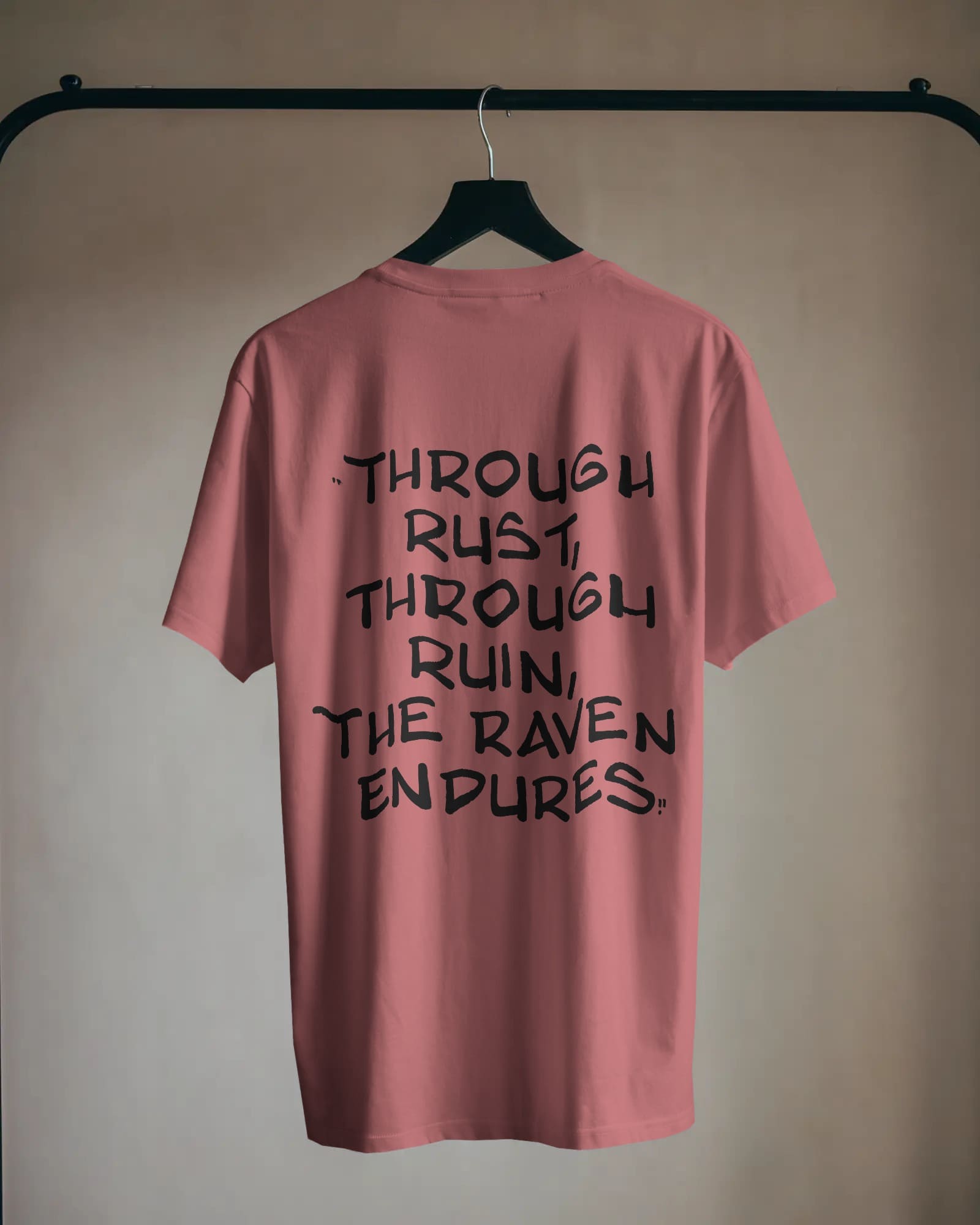 Embrace resilience and mystery with “The Raven Endures” — a powerful oversized t-shirt featuring a minimal crow design in pocket size at the front and the haunting phrase “Through rust, through ruin, the raven endures” at the back. This design symbolizes strength through adversity and the quiet determination that outlasts time and decay.